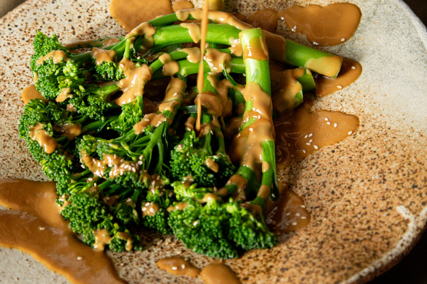 Broccolini with creamy sesame–peanut miso sauce